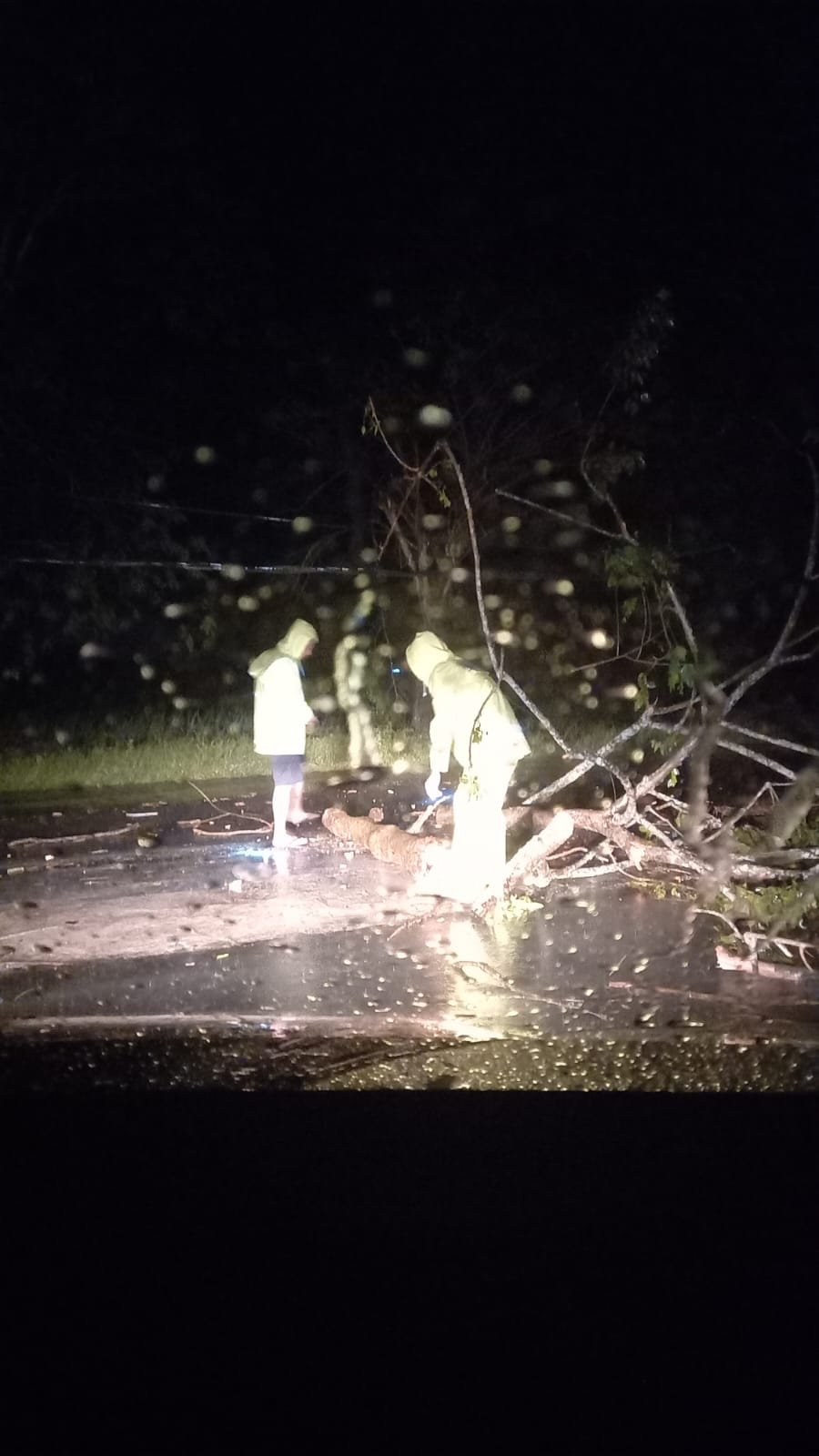 Mereka bergotong royong bersama warga setempat untuk membersihkan pohon-pohon yang tumbang.