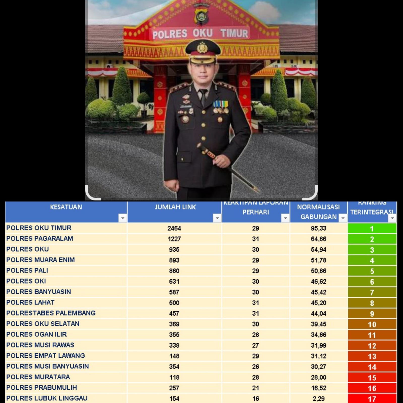 Prestasi ini menempatkan Polres OKU Timur di atas Polres Pagar Alam yang berada di peringkat kedua dengan skor 64,86, serta Polres OKU di peringkat ketiga dengan skor 54,94. Sementara itu, total keseluruhan link yang tercatat dalam sistem mencapai 10.647 link dari seluruh Polres se-Sumsel.