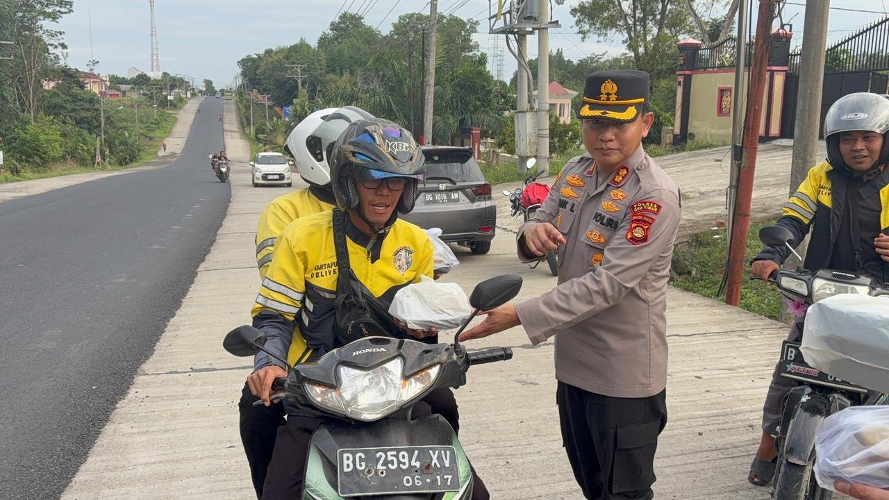 OKUTIMUR.MS – Kapolres OKU Timur Polda Sumsel AKBP Adik Listoyono S.I.K.MH. pimpin langsung kegiatan pembagian Takzil untuk pengemudi Ojek Online dan Masyarakat yang Melintas di depan Mako Polres OKU Timur.