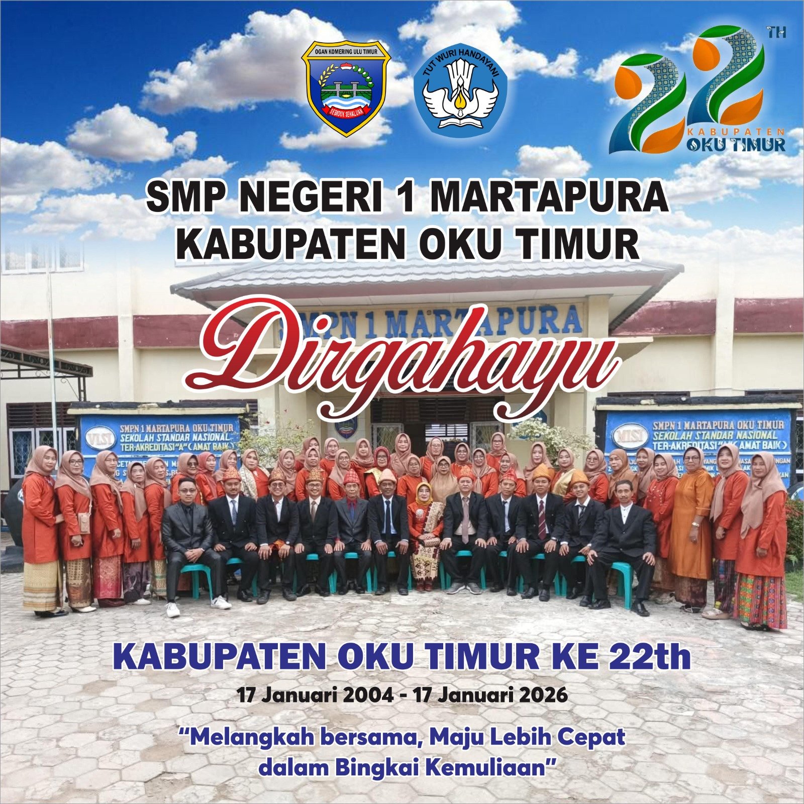 OKU Timur,MS – Kepala sekolah SMPN 1 Hj, Sigiyani Natalia SPd beserta Dewan Guru SMPN 1 Martapura Kabupaten OKU Timur mengucapkan Semat Hari Jadi Kabupaten OKU Timur yang Ke 22.