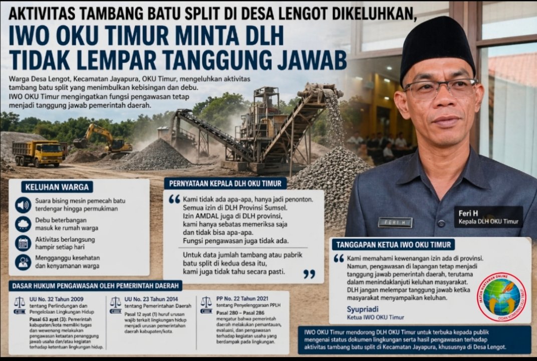 IWO juga mendorong agar pihak terkait memberikan informasi secara terbuka kepada masyarakat mengenai status dokumen lingkungan dan hasil pemantauan yang telah dilakukan terhadap aktivitas tambang batu split di wilayah tersebut. (Rls)