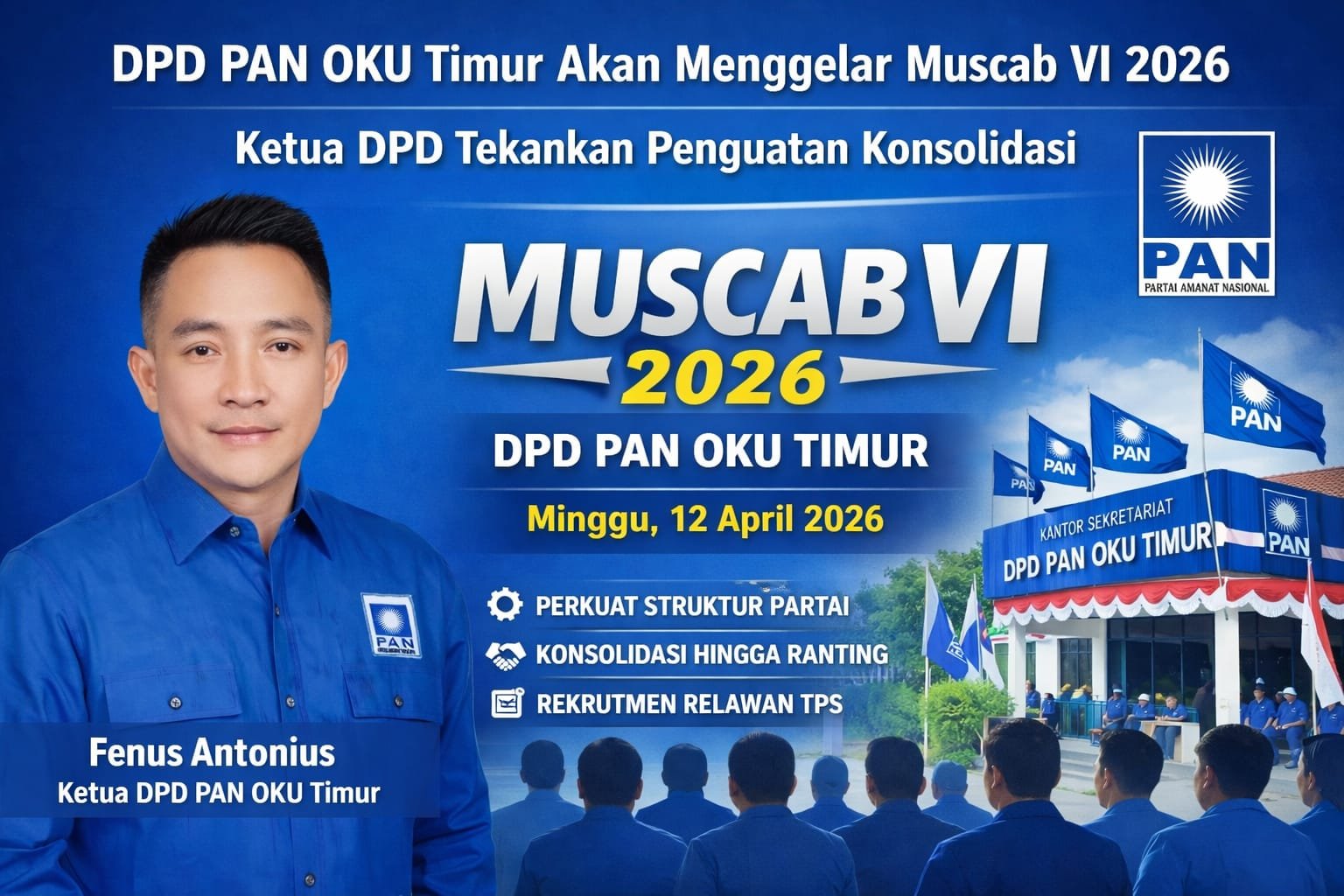 OKU TIMUR —MEDIAMASA –  Dewan Pimpinan Daerah (DPD) Partai Amanat Nasional (PAN) Kabupaten Ogan Komering Ulu Timur akan menggelar Musyawarah Cabang (Muscab) VI Tahun 2026 pada Minggu, 12 April 2026.