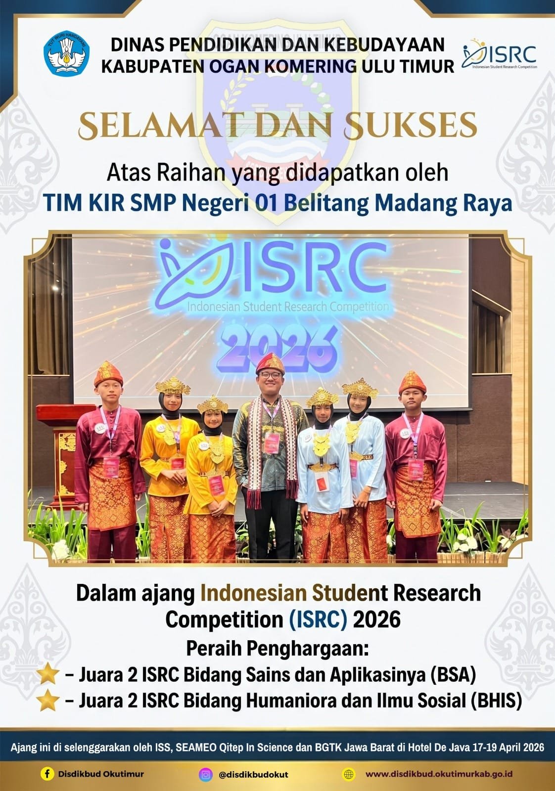 OKUTIMUR.MEDIAMASA  – Tim KIR SMP Negeri 01 Belitang Madang Raya kabupaten OKU Timur  kembali berhasil meraih prestasi gemilang dalam ajang Indonesian Student Research Competition (ISRC) 2026.