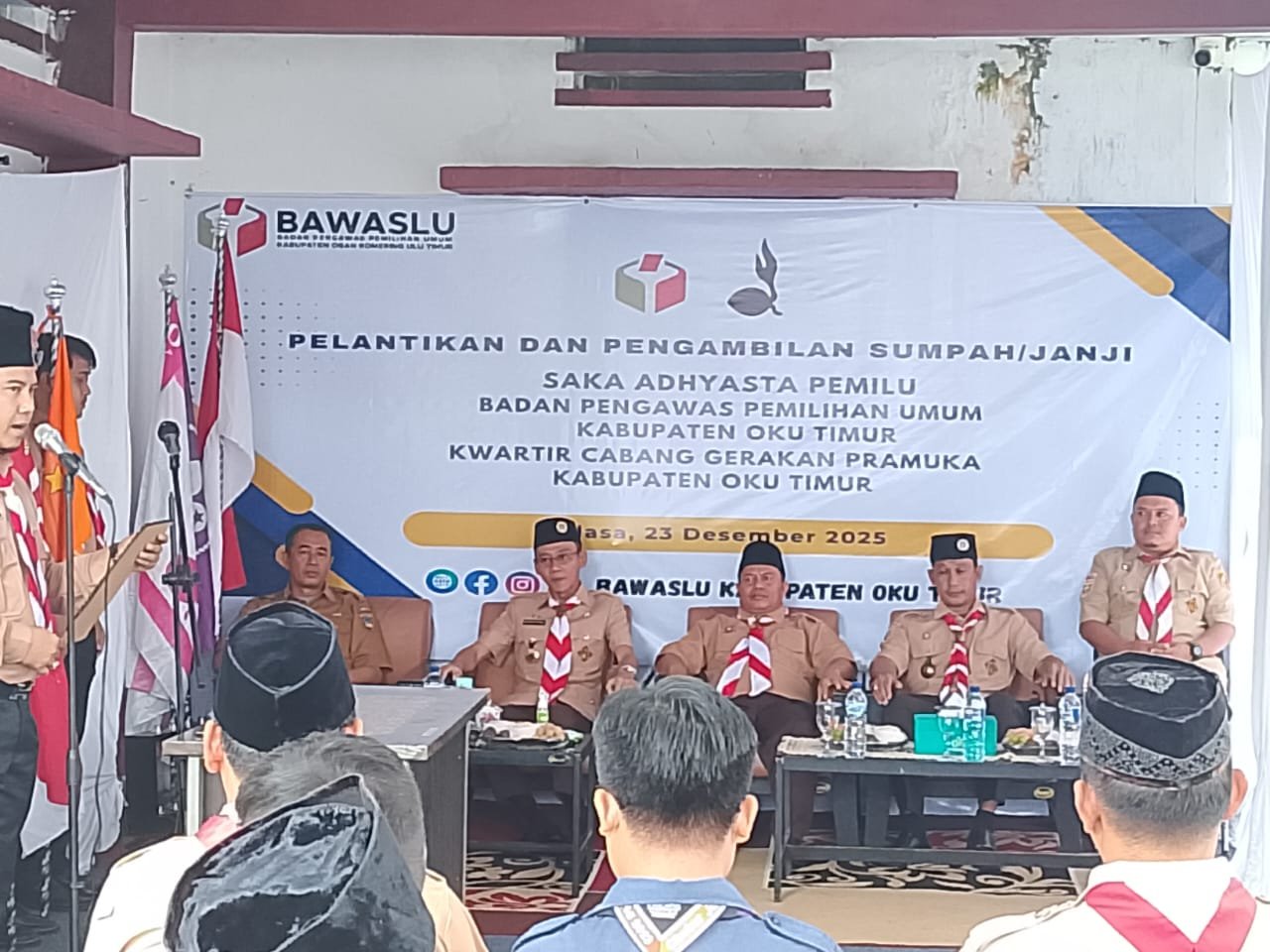 OKU Timur,MS – Ketua Kwarcab OKU Timur H.M.Adi Nugraha Purna Yudha,S.H,melantik Ketua majelis pebimbing Saka Adhyasta Sunarto,S.P dan kwartir cabang gerakan pramuka kabupaten OKU Timur masa jabatan periode tahun 2025-2030. Di halaman kantor Bawaslu OKU Timur,Selasa (23/12/2025)
